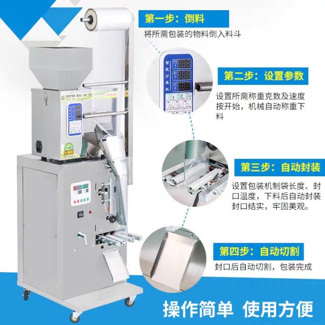 包裝機(jī)采用國內(nèi)先進(jìn)高智能微電腦控制技術(shù),是我司新款研發(fā)生產(chǎn)的小型全自動包裝機(jī)械設(shè)備,包裝美觀,精度高速度快。適合食品、醫(yī)藥、化工產(chǎn)品中的松散、無粘性細(xì)小顆粒狀、物料的自動包裝,如干燥劑、味精、洗衣粉、茶葉、白糖、食鹽、種子、咖啡、飲料、沖劑、麥片等。